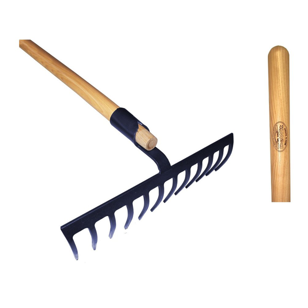 Klasické kovové hrábě s dřevěnou jasanovou násadou.
