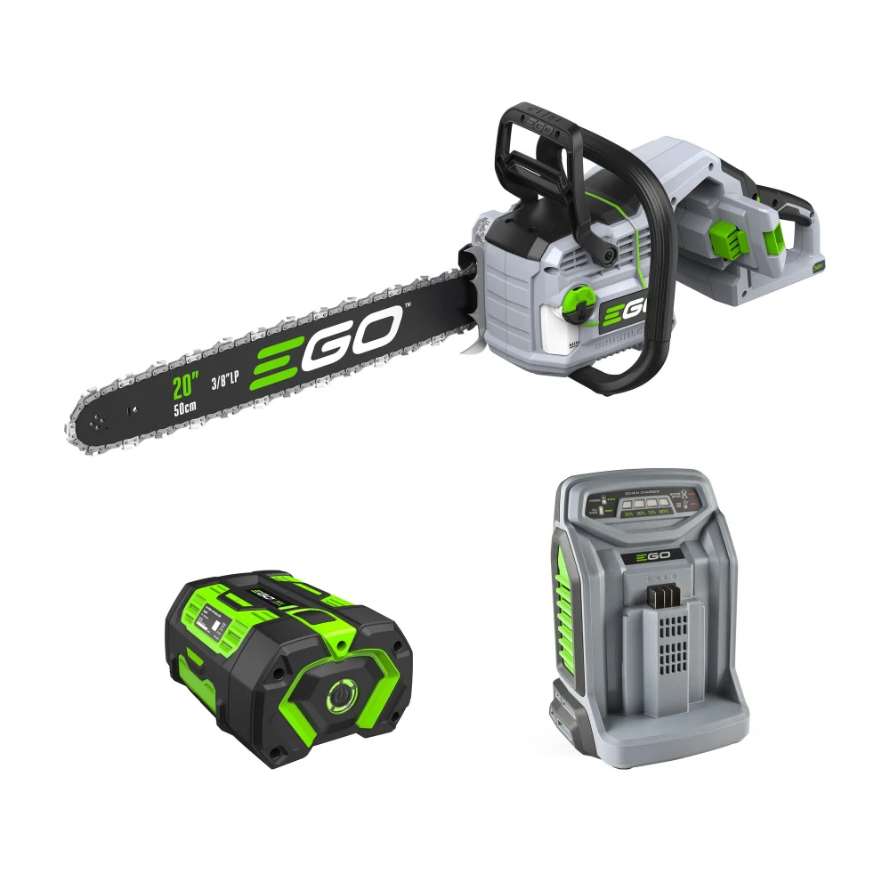 Řetězová pila CS2000E v sadě - Největší z nabídky EGO, řetězová pila s lištou 50cm a řeznou rychlostí 25,0 m/s. Pilový řetěz s dělením článků 3/8" a šířkou vodící drážky 1,3mm svědší o vysokých ambicích pily. Svým výkonem se zcela vyrovná silnějším benzínovým pilám a jedná se o ideální stroj pro řezání a dělení dřeva do ∅ 40cm. Perfektně poslouží třeba ve vybavení obcí, dobrovolných hasičů, silničářů, ale i profesionálním tesařům, sadařům, komunálním službám nebo náročným majitelům zalesněných pozemků.